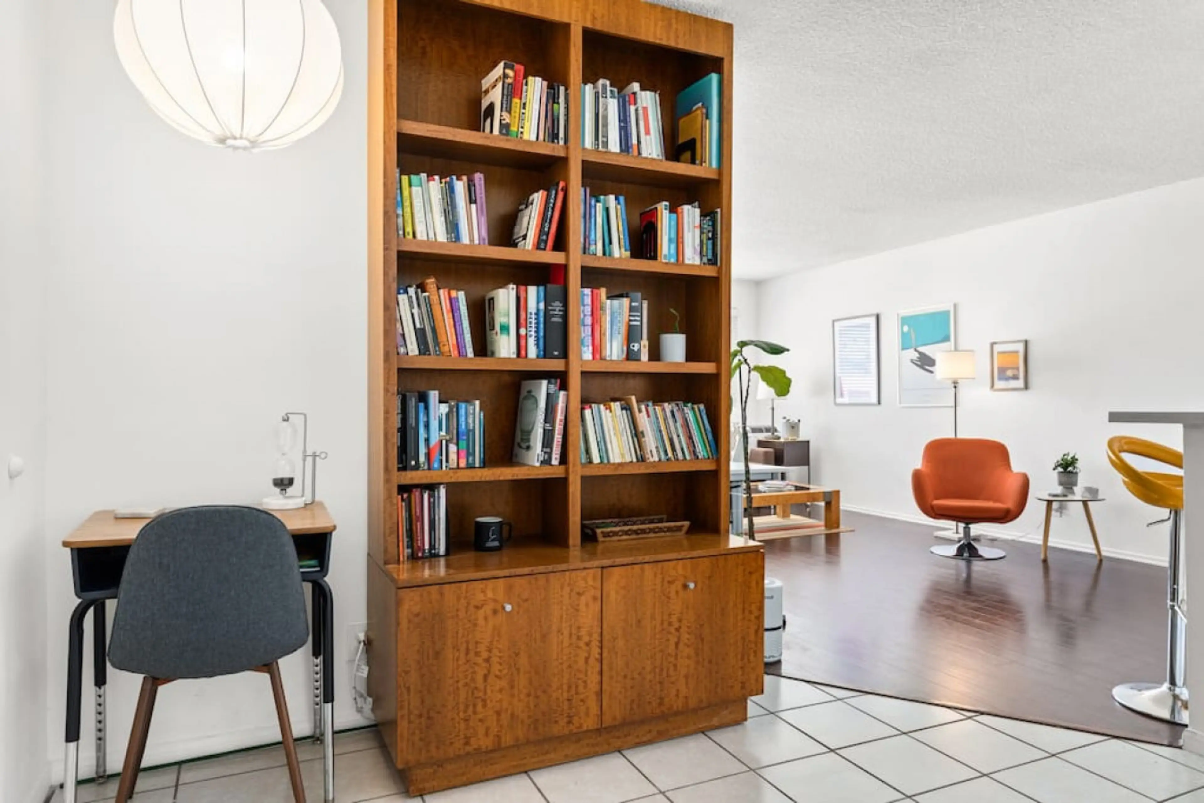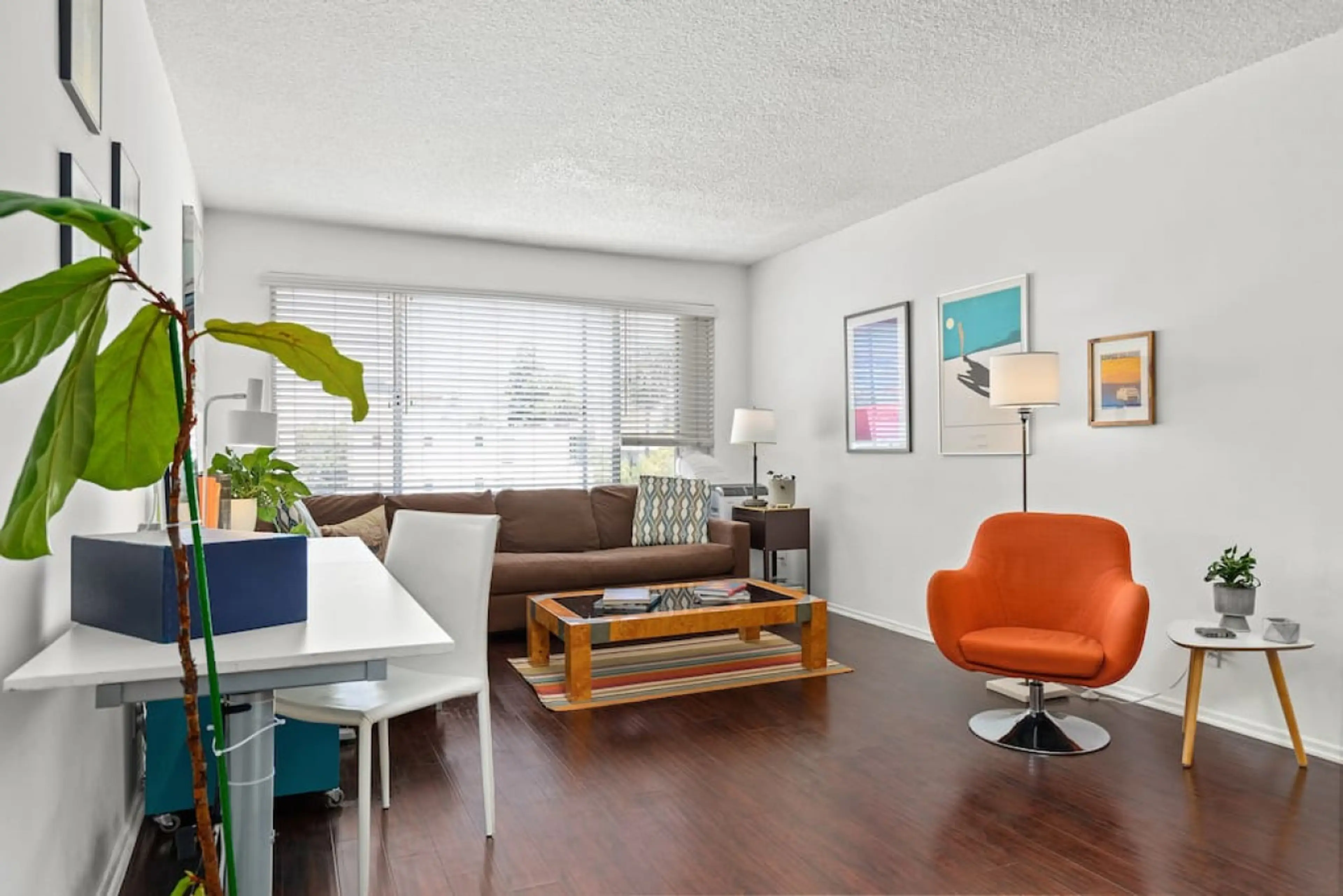 Classic early 70's Hollywood building-- this space is furnished for period style with vintage pieces alongside many modern comforts. Wake up in a king bed to a view of the Hollywood sign, enjoy cocktail hour with a sweeping view of the hills. Best of all, walk out the front door in any direction an...